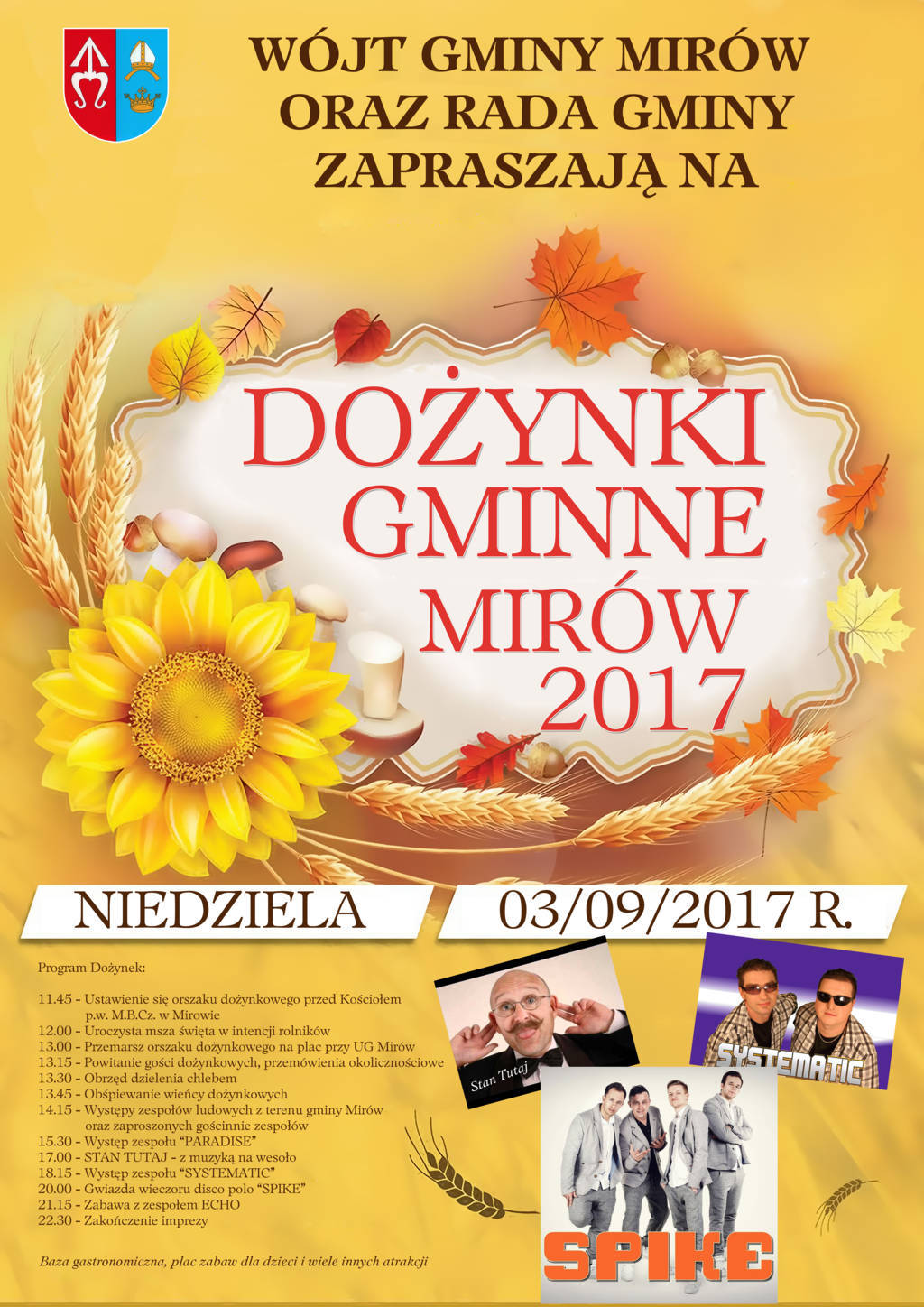 Dnia 3 września 2017 r. w Mirowie Starym odbyły się Dożynki Gminne – Mirów 2017. Uroczystości dożynkowe rozpoczęły się mszą celebrowaną przez Proboszcza Parafii ks. Grzegorza Stępnia oraz ks. Krzysztofa Świątka proboszcza parafii Gąsawy Rządowe. Po mszy świętej Pan Artur Siwiorek – Wójt Gminy Mirów oraz Wiesław Morawiak Przewodniczący Rady Gminy uroczyście przywitali przybyłych gości oraz uczestników dożynek. Starostowie tegorocznych dożynek pani Rojek Monika – mieszkanka wsi Rogów oraz pan Sebastian Pytoń rolnik z sołectwa Rogów wręczyli Gospodarzowi Dożynek –Wójtowi Gminy bochen chleba. Następnie Wójt, Przewodniczący Rady i Starostowie częstowali chlebem dożynkowym uczestników rolniczego święta.