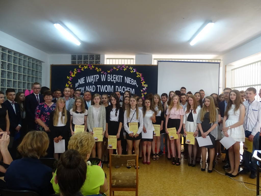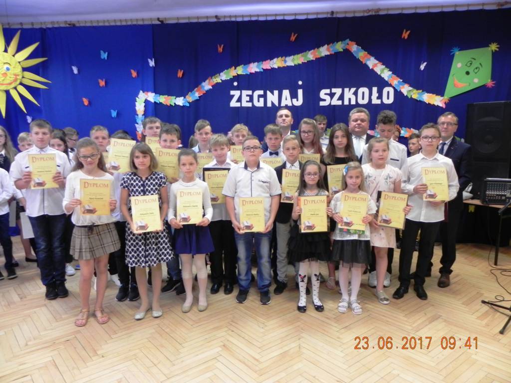 Dnia 23 czerwca odbyło się uroczyste zakończenie roku szkolnego 2016/2017. Uczniowie, nauczyciele, rodzice i zaproszeni goście zgromadzili się tłumnie w świetlicy szkolnej, gdzie wspólnie żegnali kolejny rok szkolny. Na uroczystość przybył wójt Artur Siwiorek, kierownik Referatu Oświaty Piotr Kowalik. Wszystkich zebranych przywitał pan dyrektor Jan Ulewiński. Pan wójt wręczył stypendia dla uczniów, którzy uzyskali wysoką średnią ocen. Świadectwa z wyróżnieniem oraz nagrody książkowe otrzymało 45 uczniów Naszej szkoły.